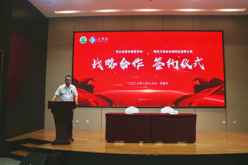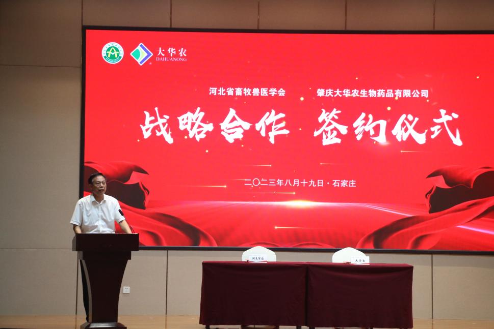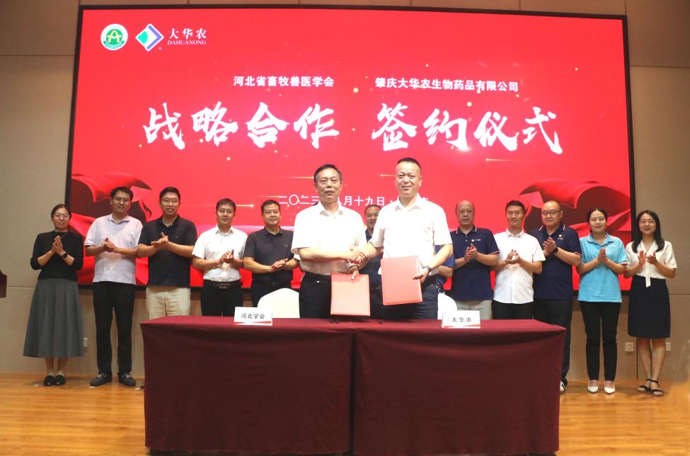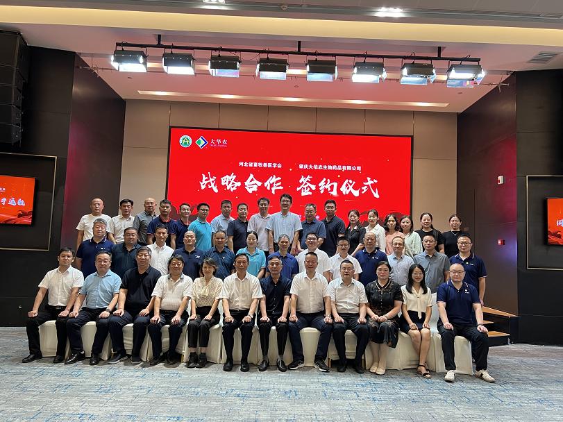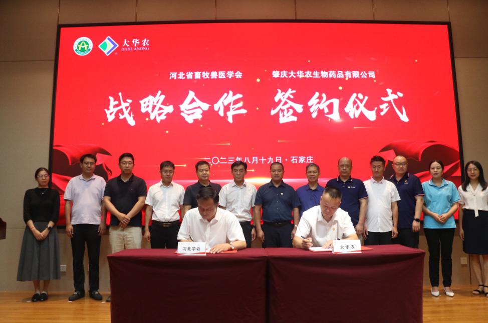 2023年8月19日,河北省畜牧獸醫學會與肇慶大華農生物藥品有限公司簽署戰略合作協議,雙方整合資源、有效協同,旨在共同努力推動畜牧獸醫科技創新,提升行業競爭力,為冀、粵兩地畜牧獸醫事業高質量發展做出積極貢獻。