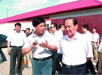 第十一屆全國人民代表大會常務(wù)委員會副委員長司馬義·鐵力瓦爾(右)特地到石家莊華牧牧業(yè)公司視察調(diào)研,在公司行唐父母代種雞場觀望臺上,省學(xué)會副理事長、公司董事長趙來兵(左)為委員長介紹行唐20萬套父母帶雞場的先進示范養(yǎng)殖技術(shù),包跨:自動加料、乳頭飲水、同步消毒、濕簾降溫等先進養(yǎng)殖工藝.